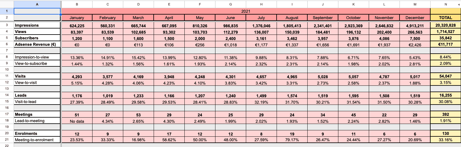 From those leads came meetings, and from those meetings came enrolments. YouTube contributed to 130 course enrolments in 2021. At an average of €5,000 per enrolment, that's €650,000 in attributed product revenue.