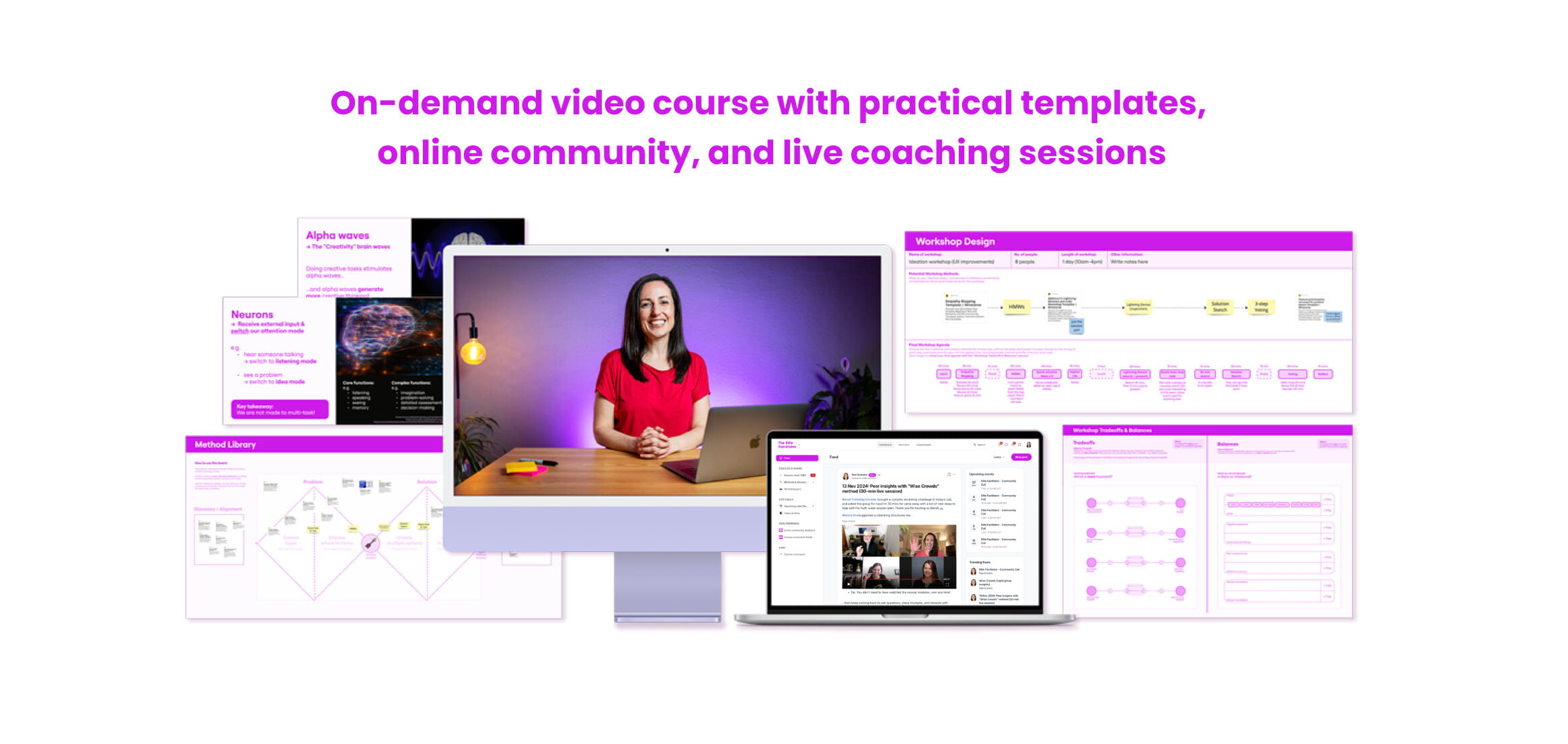 Having worked with Dee previously—at AJ&Smart and CareerFoundry—we partnered again to bring her course to life. We began with a strategy workshop, identifying her differentiators: advanced-level training for facilitators seeking career growth. We then co-created her course, recording all modules and hero videos.